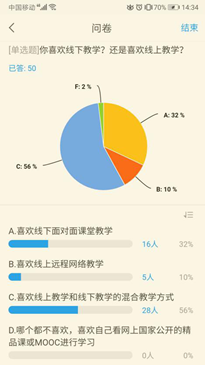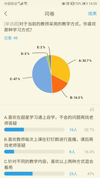 第二、提前发放在线课资料,提前和员工沟通。通过2周的备课,2月15日,学习通上的在线课学习内容和学习要求初具雏形,发放了教学内容的第一章,发放中文和英文两版电子教材,并发放与中文教材配套的习题解答,要求员工自主学习。同时,发放调查问卷,调研员工的英文水平,调研员工对英文教材是否能够读懂的情况,调研员工愿意选择哪种教材,得到调查数据,决定后续教学如何开展。通过调研发现,员工读英文教材吃力,员工英语水平参差不齐,员工大多数愿意使用中文教材,但是也有不少员工想读英文教材,结合员工的需求,本学期同时使用中文和英文两版教材,员工根据自己的能力来选择教材,教师负责对两套教材的答疑解惑。
