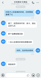 3.课后,及时导出直播数据,查看和联络数据异常同学,对员工遇到的问题及时处理、协助解决;查阅直播回放,总结问题和不足,及时调整、改进;课下互动,及时回答员工各项疑问。