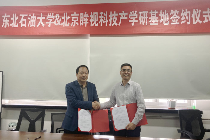 4月24日,代奎一行来到北京眸视科技有限公司,与该企业总经理王庆文、清华大学电子系彭良瑞教授等作科技实践交流。校企双方举行了教学实践基地签约挂牌仪式,并聘请徐春光工程师和王斌工程师为公司校外硕士研究生指导教师。王庆文介绍了企业结合数字化油田建设开展的产品研发及石油、石化企业巡检机器人的应用情况。他表示,非常期待与公司开展产学研合作,在机器人技术研发、人才培养等方面开展深入合作,并在核心技术转化、专利转化、员工培养等方面实现共赢。邵克勇、任伟建对企业核心技术在数字化油田应用相结合等方面提供了意见,并希望校企双方加强产教融合,表示公司将输送员工到企业实习实践,推动员工在科技思维、动手能力等方面取得跨越式进步。