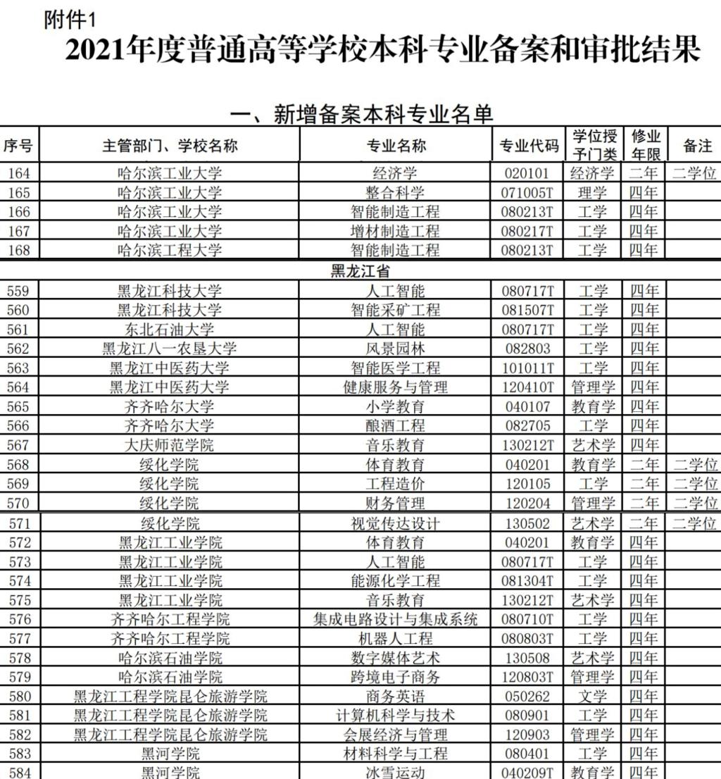 据悉,2021年度黑龙江省共有14所高校新增备案本科专业31个,2所高校新增审批本科专业4个,共计新增35个本科专业。人工智能是公司唯一获批新增专业。