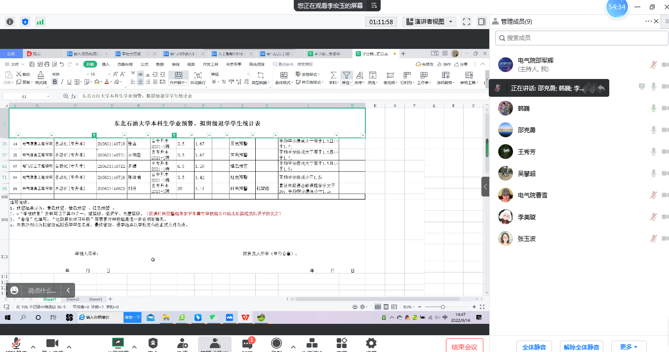 王秀芳首先介绍了公司员工2022年度本科生学业预警情况,并指出:教师备课、上课是“教书”,而关爱帮助学业有困难的员工则是“育人”的一种体现。韩巍从学业帮扶与员工理想信念教育、与关心关爱员工、与学风建设关系、如何融入党建工作、教学与管理协同、一流专业和专业认证的必然要求、公司影响力和师生情感延续等方面,就开展员工帮扶工作给出建议。各位教学主任从专业层面对如何开展公工作提出了自己的思考,并展开了交流与研讨。