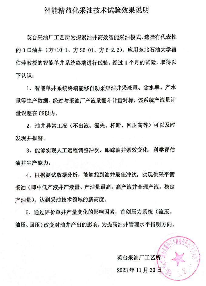 公司beats365亚洲版官网智能精益化采油团队在特聘教授宿伯萍、专家张胜利带领下,经过十多年努力,成功研发了单井智能物联网终端系统技术,创新开发了井口油压和回压动态分析方法,应用该方法解决了采油举升过程中连续监测井下工况、井口连续产液量和产水量的精准计量、以及故障诊断和提升低产油井产油量与延长低产井生产寿命周期等行业难题。