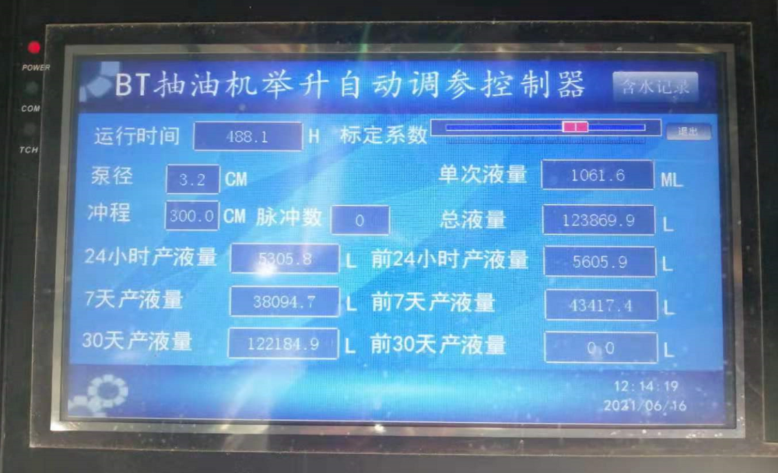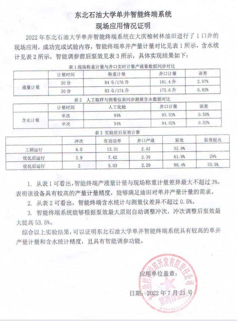 本系统技术使油井在最高系统效率状态下运行,同时可以根据产油、产水量的变化动态协调地质注水装置的工艺参数,使油田的注水和产油量实现最优协调关系,极大地节省能源和降低了碳排放,使油田生产和经济指标达到行业最好的水平。系统采用了压差技术和抽油泵运行工艺测量单井产量,经过与采油厂翻斗计量对标,实现计量误差小于6%。依据产量变化跟踪调整抽油机冲次,综合应用智能控制策略实现抽油机的实时最优控制,降低能耗在10%以上,延长设备的使用寿命15%以上。