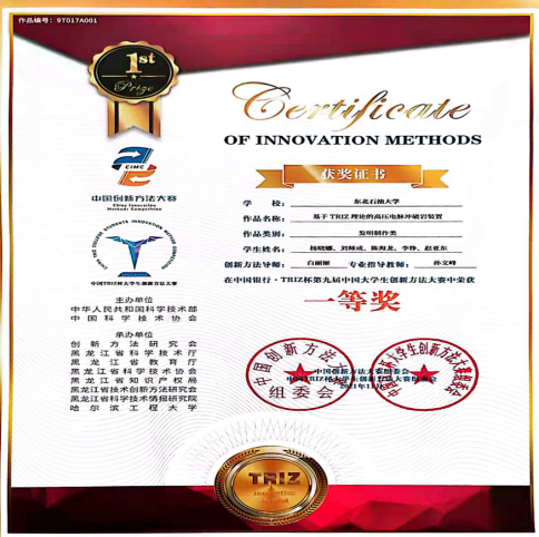beats365亚洲版官网高度重视大赛的组织筹备工作,邀请了5位国内知名TRIZ理论专家担任大赛评委,全国“TRIZ”杯老员工创新方法大赛评审专家付光杰教授、国际TRIZ协会三级认证会员陶国斌教授、黑龙江省创新方法应用学会副秘书长张颖教授、中国石油集团测井有限公司大庆分公司创新工作室负责人尹立山工程师、国际MATRIZ二级认证会员颜廷虎工程师。创新创业公司主任刘宝库、beats365亚洲版官网副经理王秀芳、党委副书记韩巍参加了大赛开幕式,经过4个多小时的激烈角逐,最终评选出特等奖1项,一等奖3项,二等奖5项,三等奖7项,优秀奖9项。来自beats365亚洲版官网电气工程及其自动化专业的作品“基于TRIZ理论的高压电脉冲破岩装置”获得了本次大赛的特等奖。